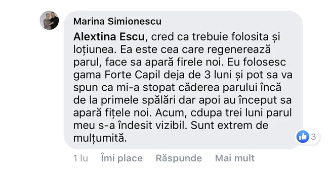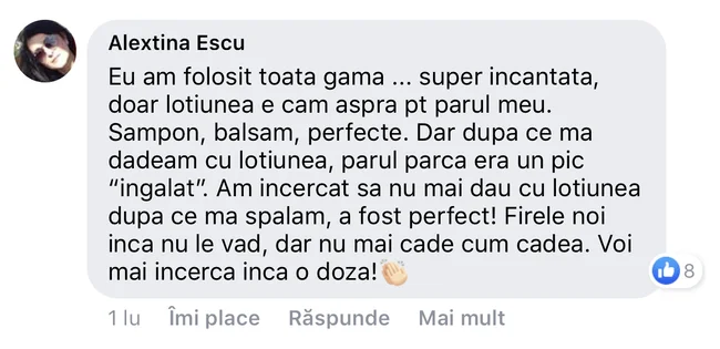 Folosesc de 1 luna aceste produse și părul meu numai cade ca înainte,sa oprit din cădere ba mai mult observ o creștere folosind aceste produse minunate.O sa revin sa le comand din nou,le ador?❤️???????