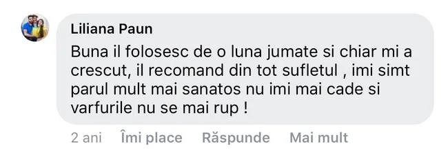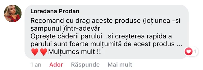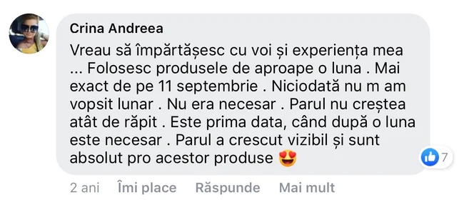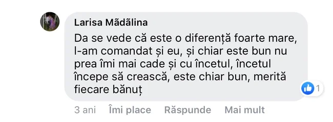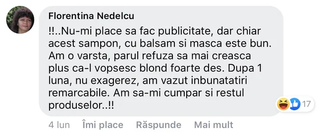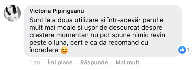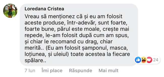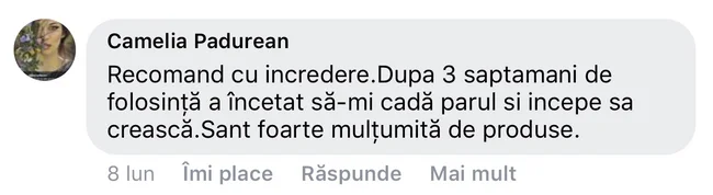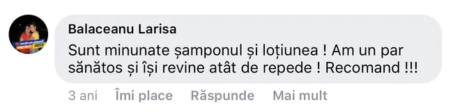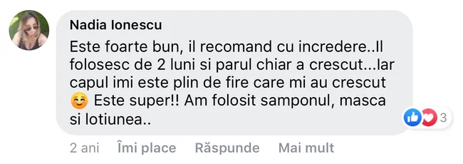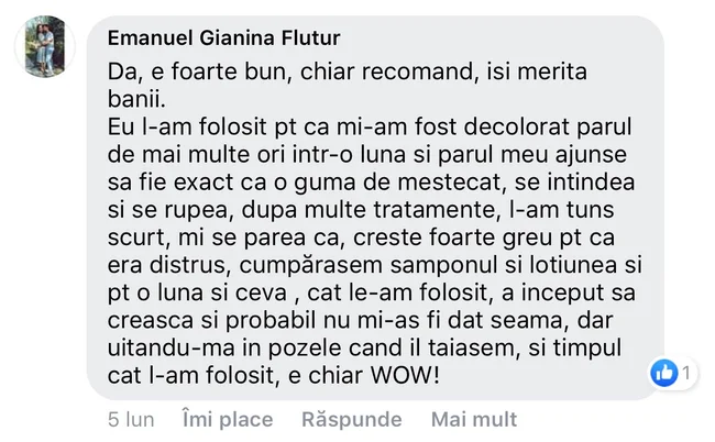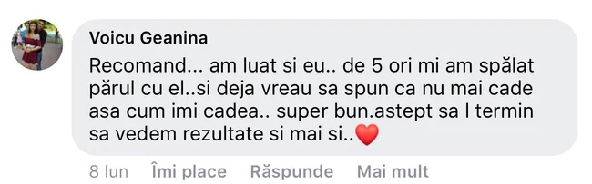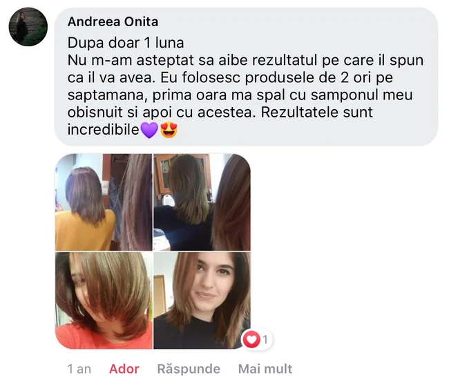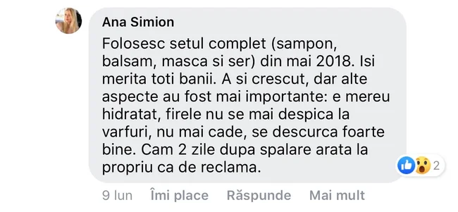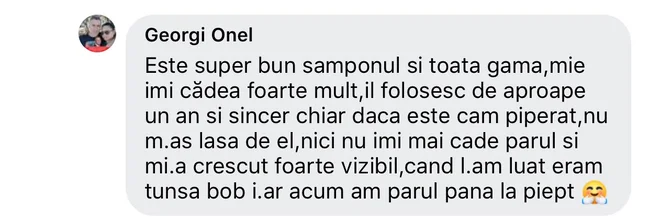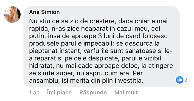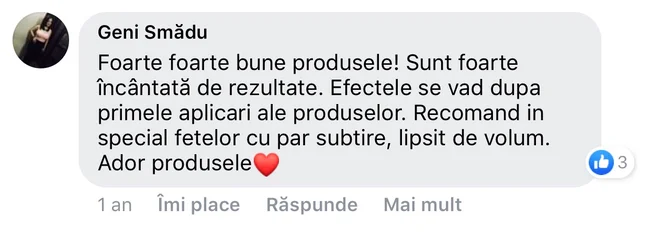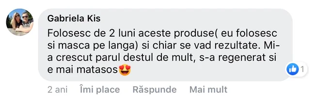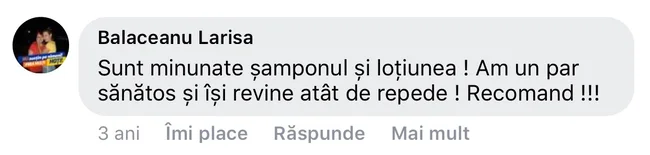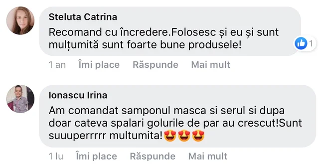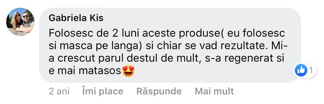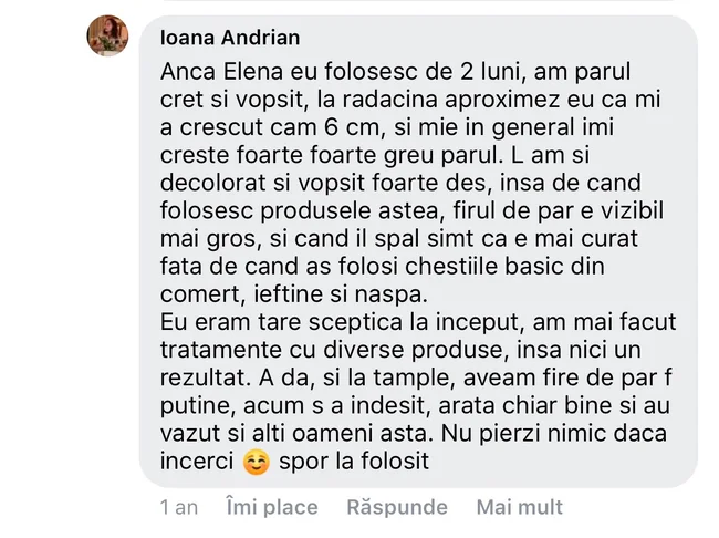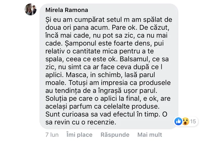 Am un an de când folosesc acestea produse și vreau să spun că sunt extraordinare! Am făcut o pauză cam mare, din cauze financiare nu mi-am mai permis să cumpăr, dar diferența este enormă. Am încercat mai multe șampoane, îmi pica părul la greu. Am dat comandă doar pentru șampon și abia aștept să vină comanda. Sunt extraordinare aceste produse. Le recomand cu drag și încredere!