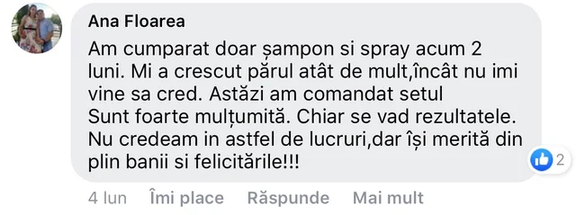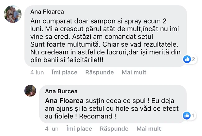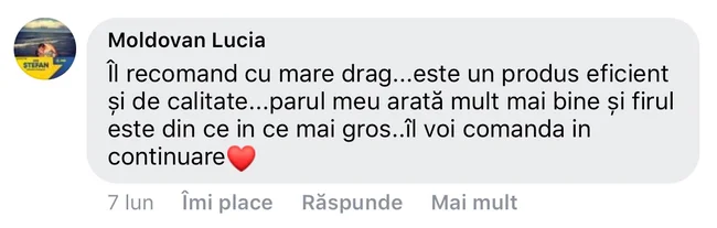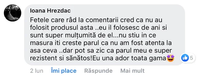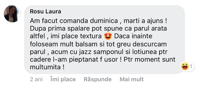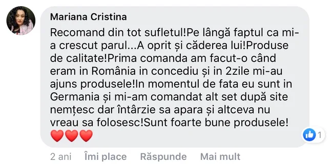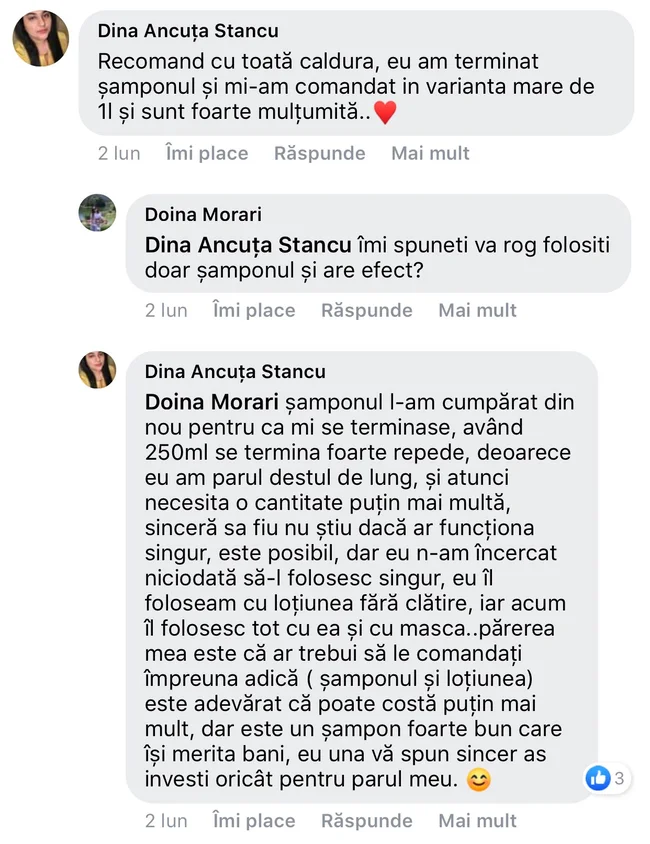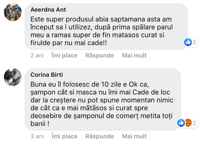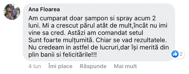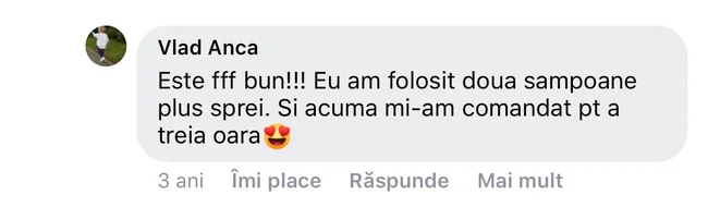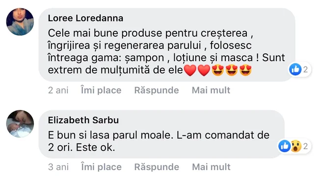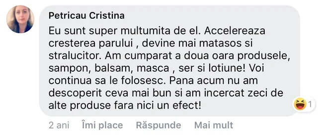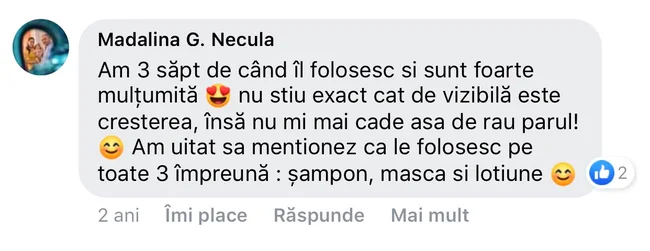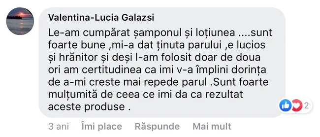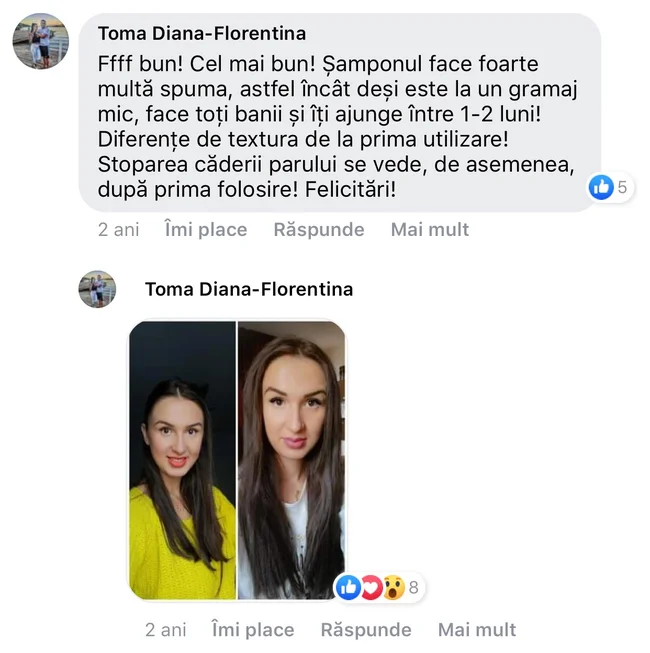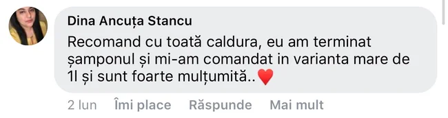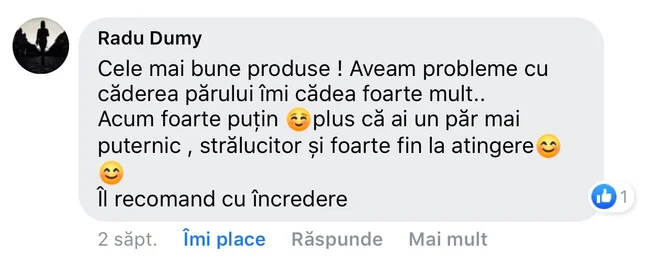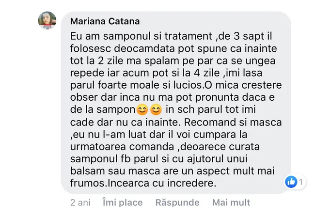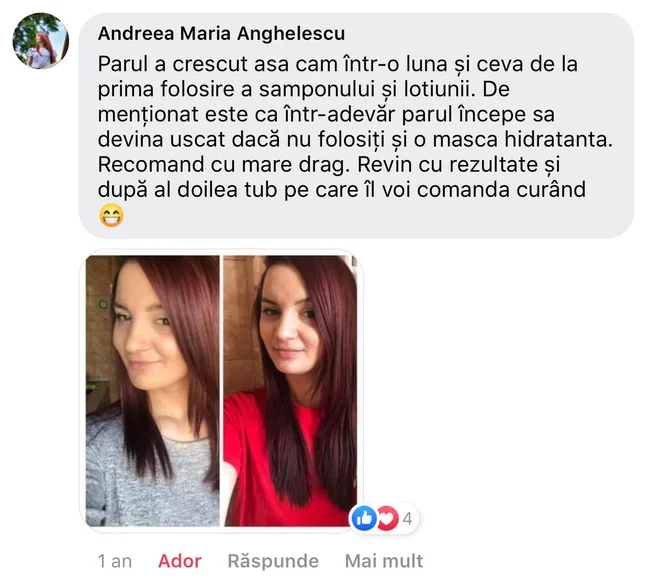 Am un an de când folosesc acestea produse și vreau să spun că sunt extraordinare! Am făcut o pauză cam mare, din cauze financiare nu mi-am mai permis să cumpăr, dar diferența este enormă. Am încercat mai multe șampoane, îmi pica părul la greu. Am dat comandă doar pentru șampon și abia aștept să vină comanda. Sunt extraordinare aceste produse. Le recomand cu drag și încredere!