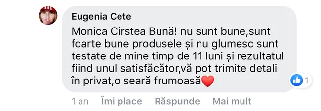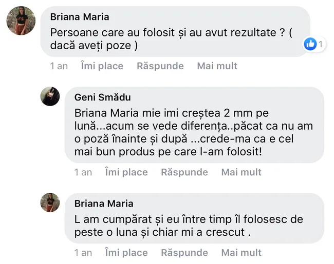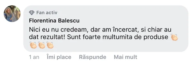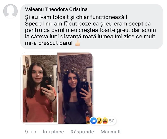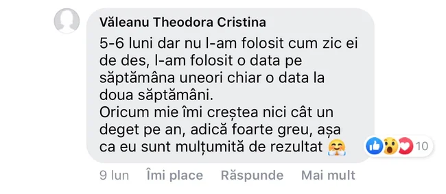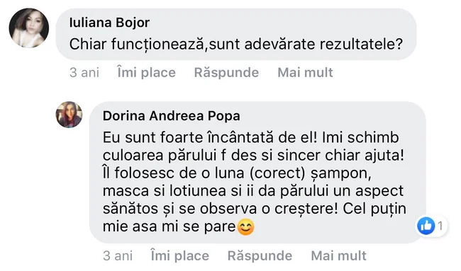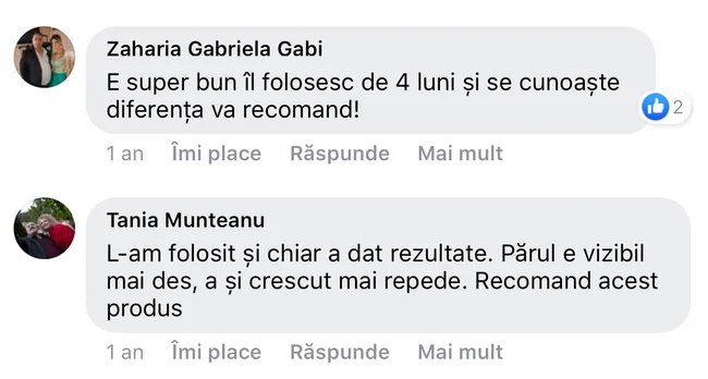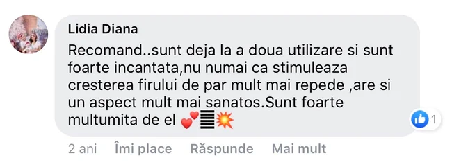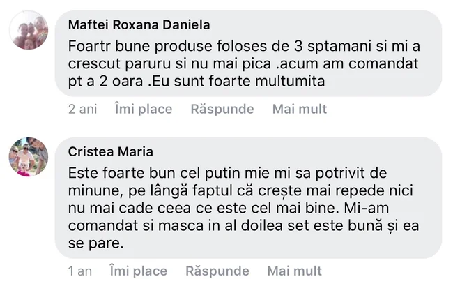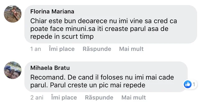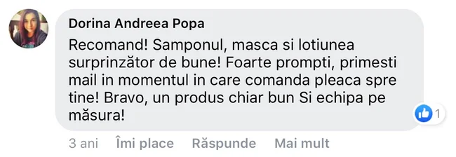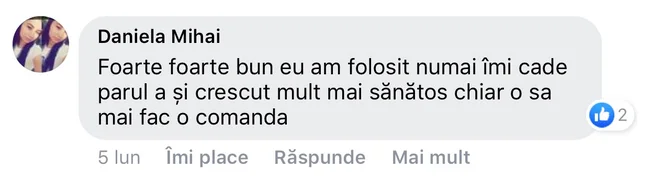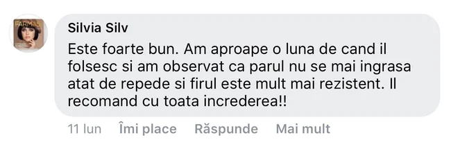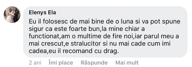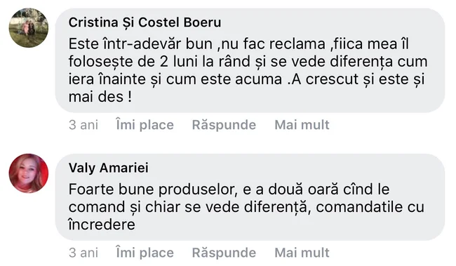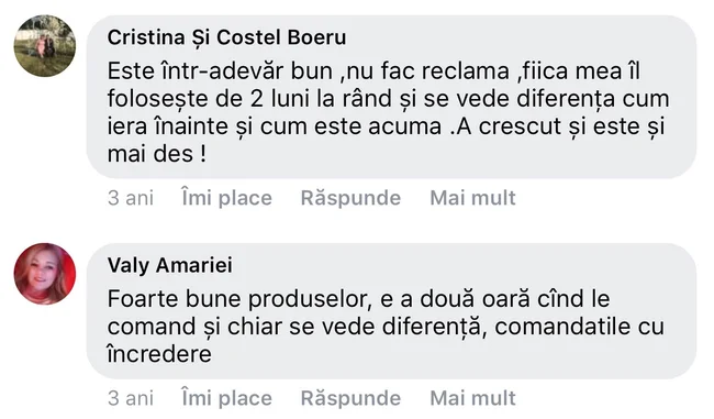 Sunt foarte bune produsele dvs. Eu folosesc gama pt crestere par in lungime de anul trecut si spre surprinderea mea nici parul nu mi mai pica atat de mult si inca nu am apucat sa folosesc fiolele pe care mi le am comandat. Eu sunt mai mult decât multumita si chiar am un par foarte dificil, ondulat, gros, fire albe, uscat tot timpul... Super!
