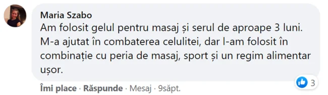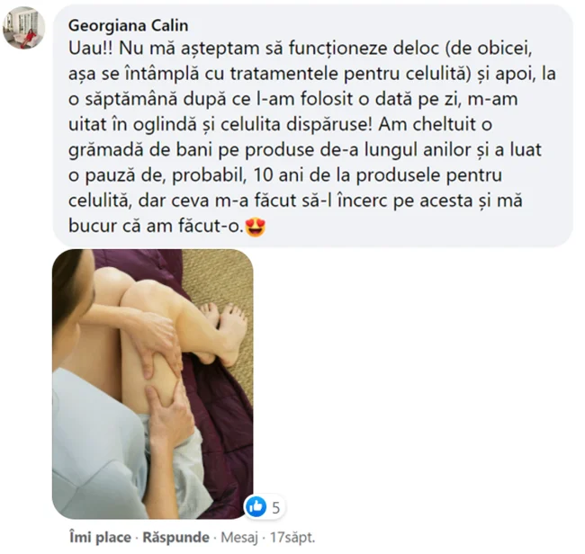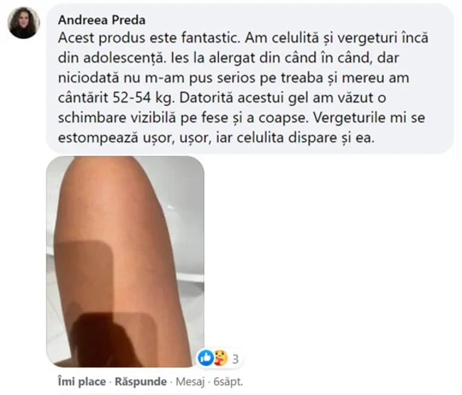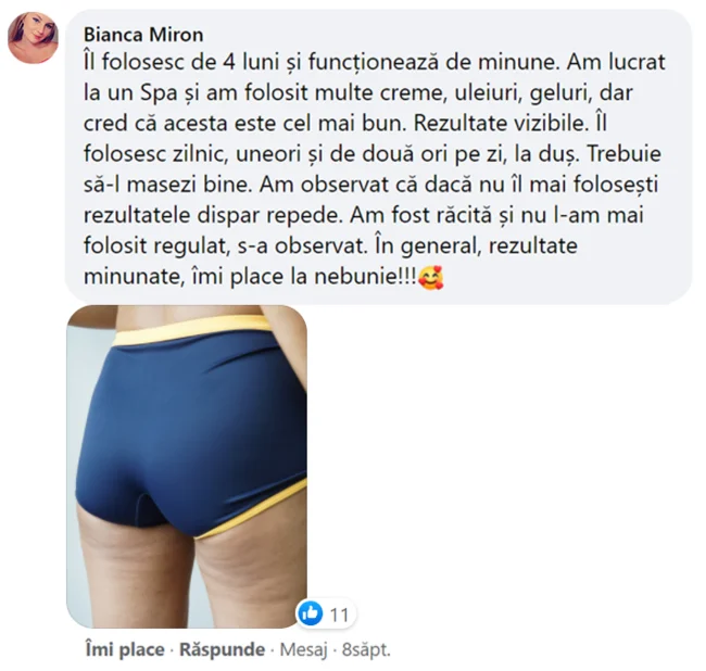 Pielea obține nivelul necesar de hidratare și devine mai moale. Concentrația mare a celor 4 ingrediente active tratează celulita rapid și eficient.